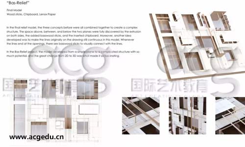 He同学:作品集中的一个项目是在康奈尔大学上夏校的时候花六周做出来的。这个项目包括数十个不同类型的材质的模型以及绘图作品。从第一周开始抽到的功能词“intersection”开始进行创作,用模型和绘图对这个词汇进行深入的解读和再创造。我的创作理念是从 intersection开始对其进行多重意义的解读,并尝试将这个词语不同的意义转化成作品的元素,并将其融合在一起,借此来探索空间与体量。