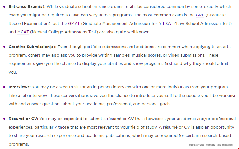 入学考试:虽然有些人可能认为研究生院入学考试很常见,但您可能需要参加的确切考试可能因课程而异。最常见的考试是GRE(研究生入学考试),但GMAT(研究生管理入学考试)、LSAT(法学院入学考试)和MCAT(医学院入学考试)也相当有名。