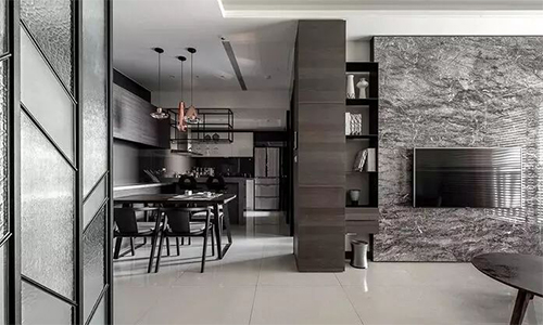 玻璃,铁件,具镜像反射效果的灰镜,及凸显豪宅质感的灰钢石,展现出现代风格冷冽的特质,设计师还巧妙利用钢刷木皮与壁纸,为空间注入温馨氛围,达到微妙的平衡。