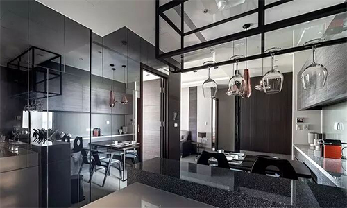 设计师巧妙利用铁件及多种不同特殊纹理玻璃拼贴,打造具有蒸蒸日上意图的树形隔断,现代感的设计,穿透的视觉效果,既不影响采光,也巧妙避开穿堂煞的风水禁忌。