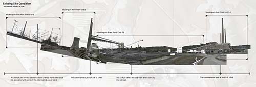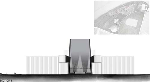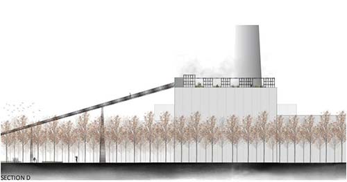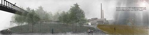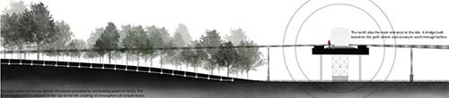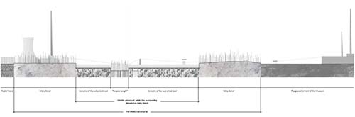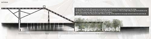 煤坑的顶面将被保留下来,人们可以从桥上看到煤粉的剩余部分。电梯将大桥与地面连接起来,可以将人们带到隧道内。从微小的狭缝中落下的微弱的光线掠过地面。当人们看到顶部时,这是一系列风景。隧道穿越后,将回到300万亿年前,那个丛林里的所有植物都代表那个坑里的煤来自哪里。