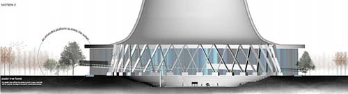 在原有的冷却塔施工的基础上,建立了一个凹陷的表演空间和一个环绕的走廊。 这个设计正试图让人们有一个清爽的体验,在冷却塔里享受这个节目(可能是一场音乐会或其他行为艺术)。 高架走廊进出水幕,界面会有一些乐趣。混合着落水的声音,这将是一个难忘的音乐会。