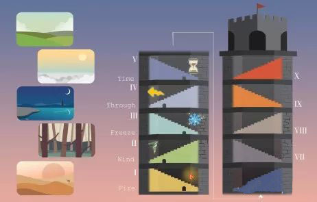 整个游戏是在一个高塔中进行的,每一层都是每一个环节,总共十层。左边的五个场景是主角的幻影场景。