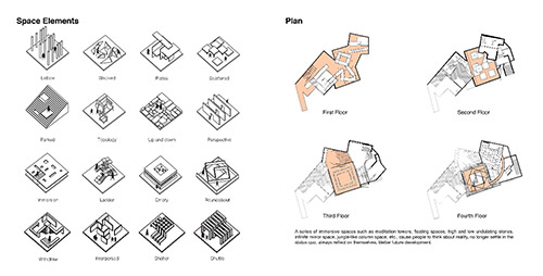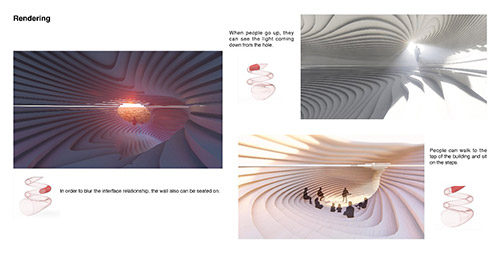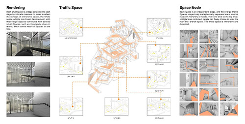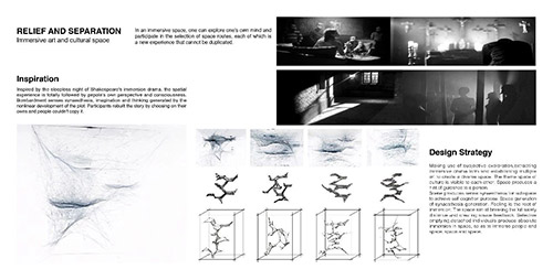 放空和抽离――浸入式空间探索。这是第一次对于学科交叉跨界的实验性设计,灵感来源于莎士比亚浸入式戏剧不眠之夜,以人主观意识跟随角色进入视角。人们可以自主选择路线,以剧情的非线性发展产生自我的想象和思考。参与者将故事提炼重构,无法复制。设计策略:1.提取浸入式戏剧碎片化形式,在整体空间制造不同场景,建立多重具备独立性的艺术文化主题空间。2.抓住浸入式戏剧“不完整却清晰”的特征,提取相互浸入的蛛网元素以规划整体场景线路的错综,建立多层次室内路径,场景间具备可视性。3.浸入式戏剧的诞生源于人们“极致体验感”,局部空间适当突破常规尺寸限制,打破安全距离,制造空间反馈。4.为达到放空和抽离后的自我认知目的,大整体提取欧洲巴别塔建筑形式,延伸空间高度,弱化立面层次关系,空间形态具备仪式感。设计目的:空间与空间的浸入、人与空间的浸入。