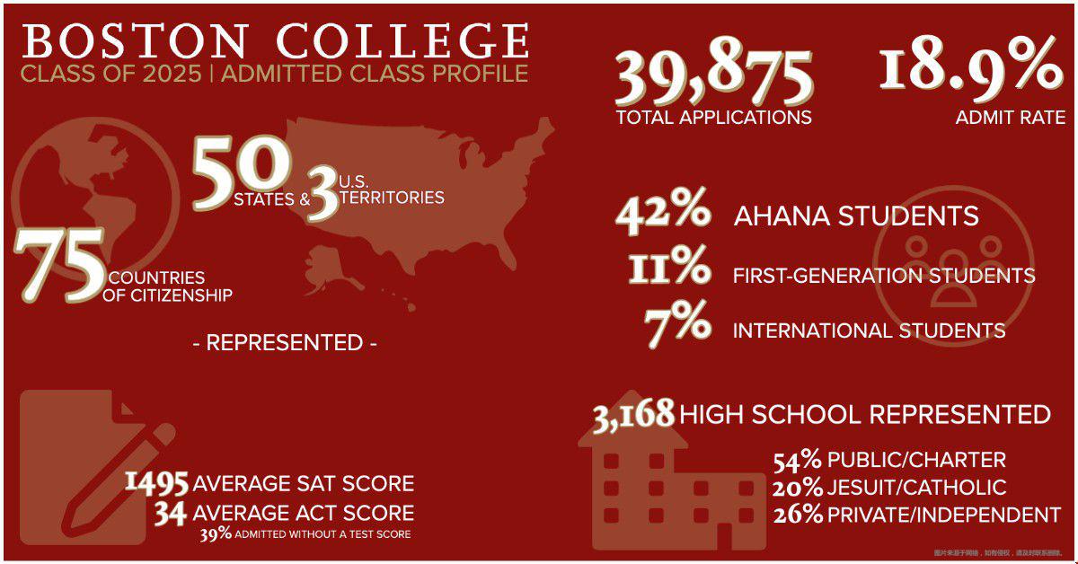波士顿学院2021FALL录取新生共计有39847人申请,录取了7587人,总录取率为19%,最终注册入读的人数为2516人,入读波士顿学院,其中女性占53%,男性占47%。比起往年录取率下降4个百分点,预示未来申请难度会增加。