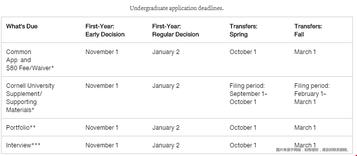 在通用申请(CA)、学校报告、辅导员推荐、两位老师评价、年中报告,当您的年中成绩可用时、官方中学/高中成绩单、$80 申请费或费用减免、康奈尔大学问题和写作补充 (CA)、面试或作品集和设计提交。