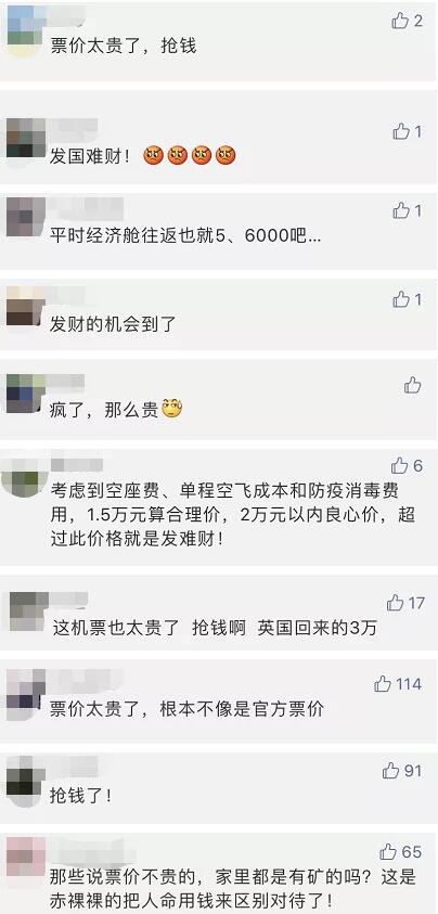 如此高昂的票价一经曝出,就引发了广大网友的激烈讨论!其中不少人都认为4万人民币的票价实在是贵到离谱,不是一般家庭能够承受的了的。并且还有人指责航空公司是借此机会大发国难财。