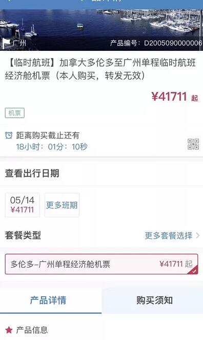 随后,根据微信网友发布的临时航班购票支付链接信息,单程经济舱机票价格为41,711人民币(约8,000加币)。