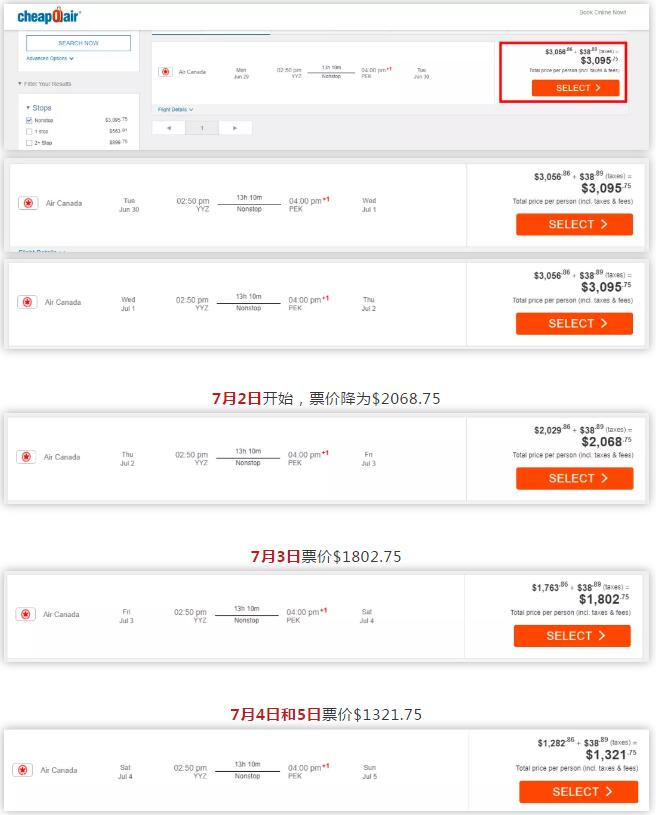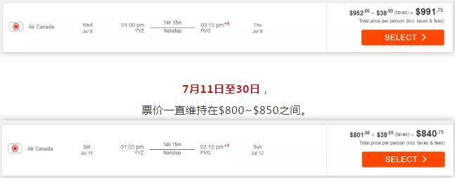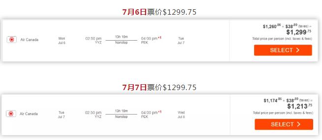 从7月7日起,票价降到$1000加币以下,单程价格为$1299.75
