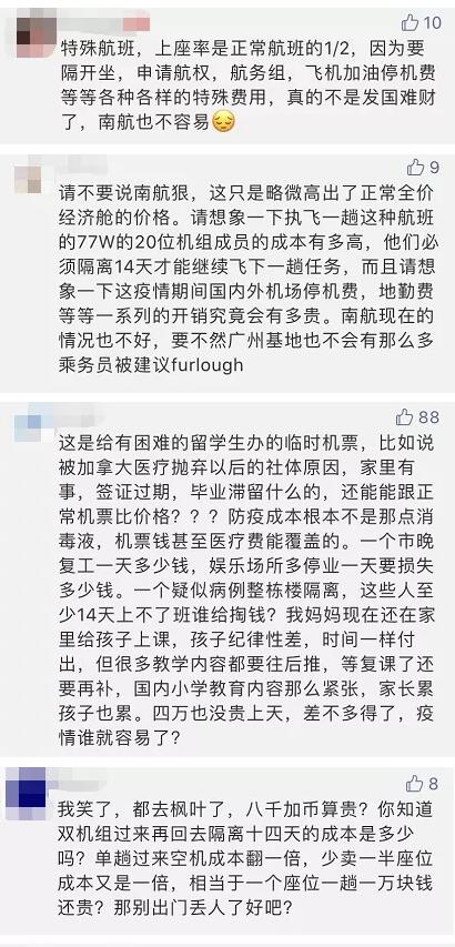 另一方面,还有很多人表示,这次特殊时期包机回国的上座率低,同时还有其他各种各样的特殊费用,机组人员隔离14天等都是成本,4万人民币真的不算贵了。