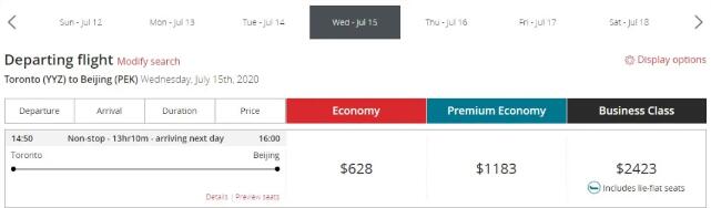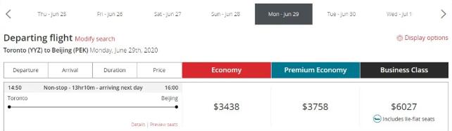 但不知道是不是因为机票数量有限,在订购机票时已经看不到6月24日直飞往返多伦多-北京的机票了。
