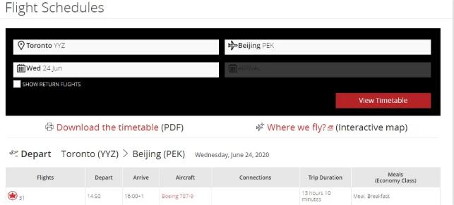 据加航官网显示,6月24日有一班,从多伦多直飞北京的航班。