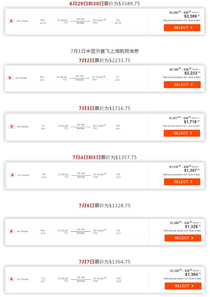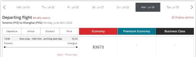 加航官网目前能看到的最近一班直飞往返多伦多-上海的航班是6月29日,票价为$3673。