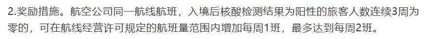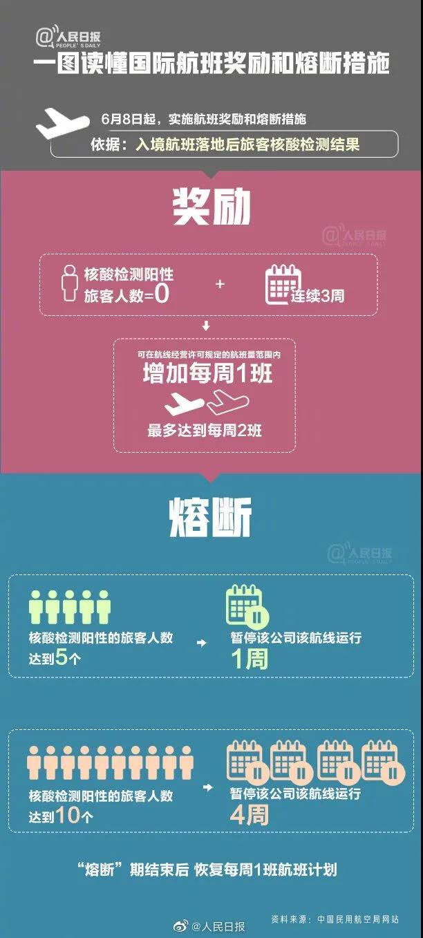 自6月8日起,在“五个一”政策的基础上,实施航班奖励和熔断措施。
