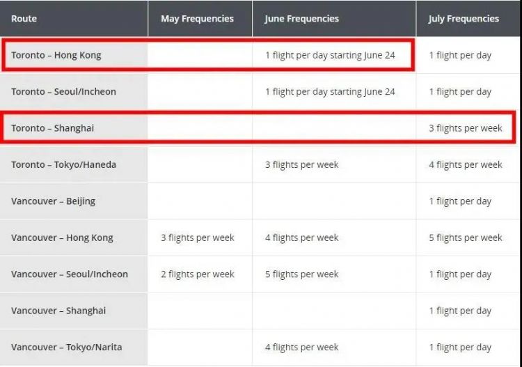 而根据加航在今年5月22日发表的新闻通告,加航在今年6月营运的国际航线将增至58条,其中包括继续营运从温哥华至香港的航线。而从6月开始至7月初,加航将继续扩展国际航线,其中就包括在获得政府批准的前提下,恢复从温哥华至上海的航线。