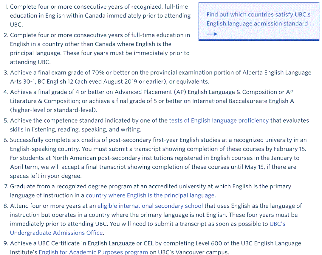 那么咱们先来说语言要求。UBC官方一共有9个方式,可以达到它的语言要求。对于国内申请的考生而言,最适合的就是条件4和条件5。