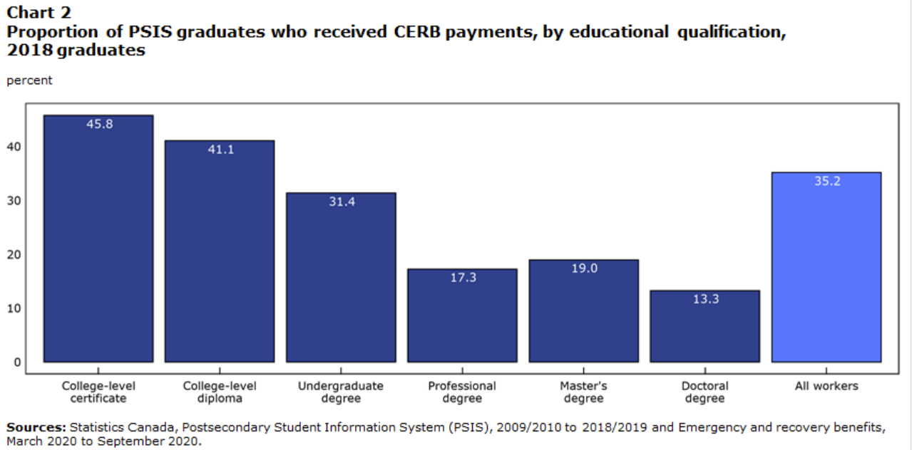 在2018年的毕业生中,拥有较高学历的人比拥有较低学历的人获得CERB付款的比例要小。