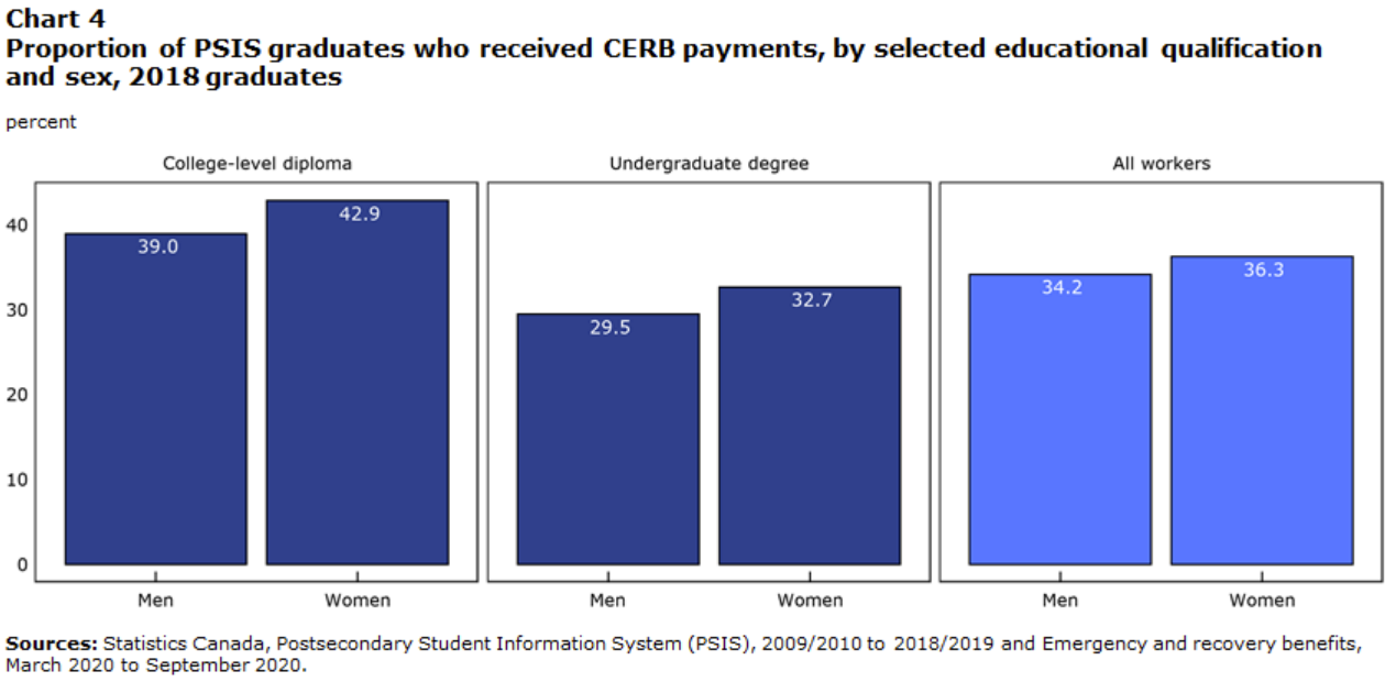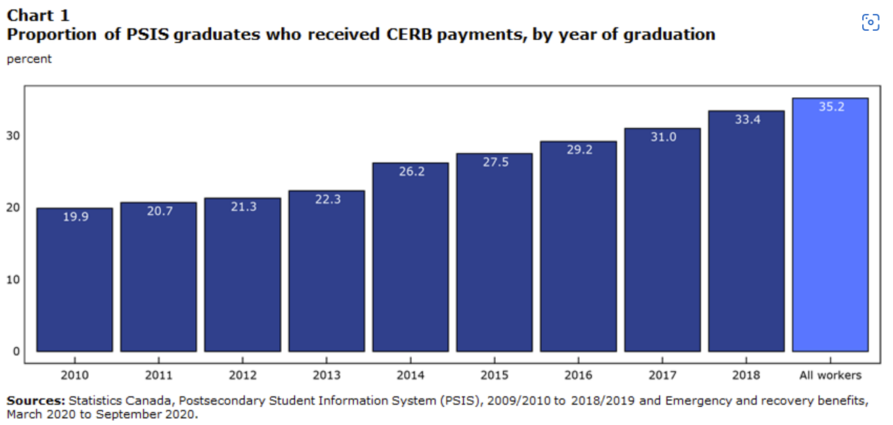 当考虑到毕业后的时间时,研究还表明,最近的毕业生比之前的毕业生更可能获得CERB。