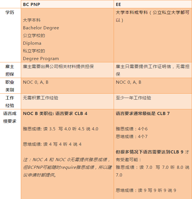 别急,一个表格让你一目了然BCPNP和EE的各项要求对比: