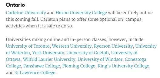 网课教学:卡尔顿大学(在安全的情况下将提供一些可选的校园活动)、休伦大学学院。