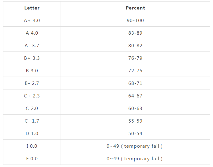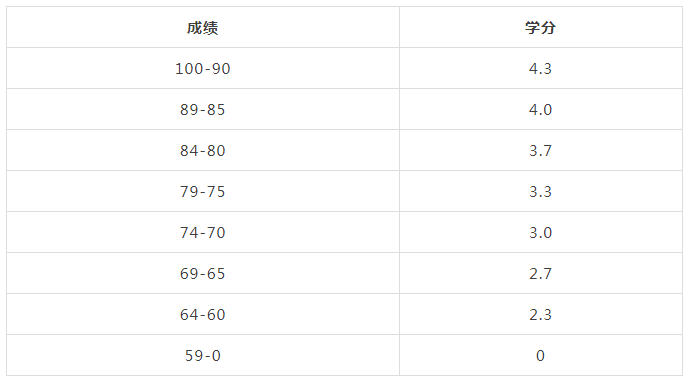 不同于4.0算法,加拿大GPA4.3算法是将百分制换算成0-4.3不同的学分,共分为8个不同的梯度,对应的换算方法如下: