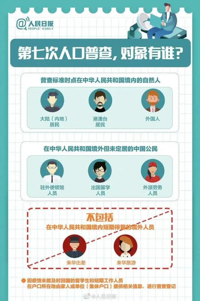 据人民日报报道,第七次人口普查不仅包括在中国境内的自然人,比如大陆(内地)居民、港澳台居民、外国人,同时还包括在中国境外,但未定居国外的中国公民,比如驻外使馆人员、出国留学人员、外派劳务人员。