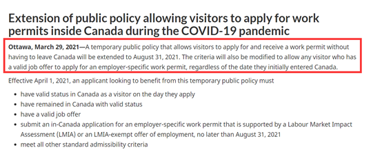 根据2021年3月29日IRCC发布的消息,持有旅游或者访问签证在加拿大的外国公民目前可以享受此政策到2021年8月31日。