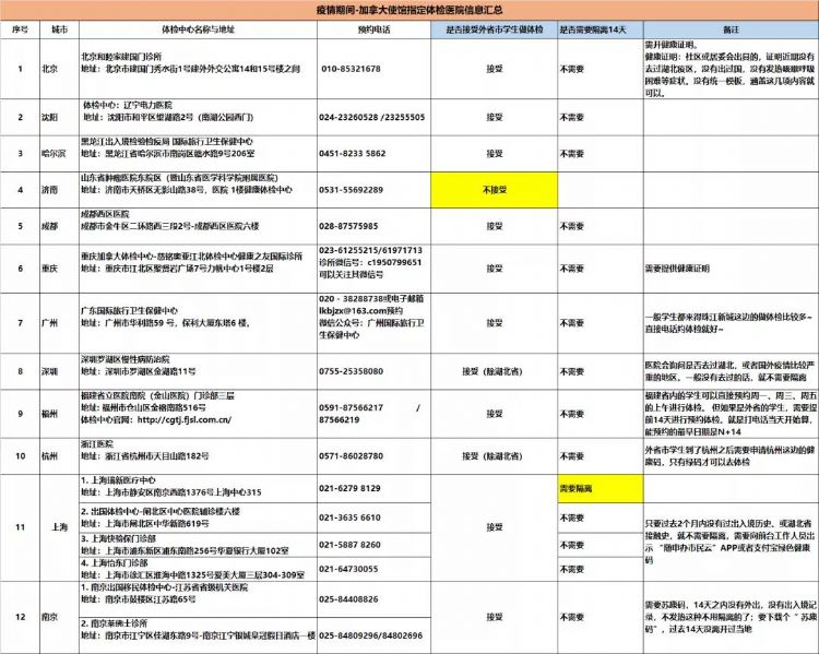 以下是加拿大大使馆在疫情防控期间指定中国大陆体检中心的具体情况,供大家参考!