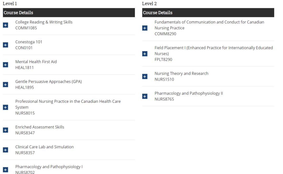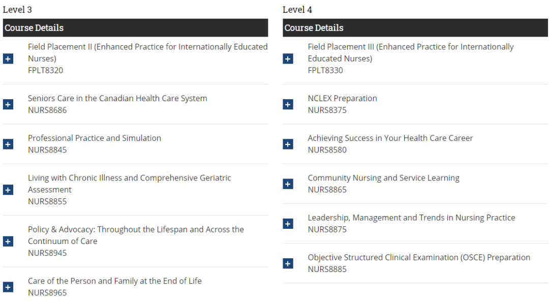 通过整个专业的学习,学生将获得在加拿大医疗保健系统中执业所需的基本护理知识和技能。整个教学过程将使用最先进的护理实验室和沉浸式模拟仿真医疗套件。学术重点是专业实践,包括护理评估,干预,护理计划制定等。同时这个专业也是根据安大略省护士学院(College of Nurses of Ontario)的专业标准和注册护士(Registered Nurses)的职业考试资格而制定。采用学术写作、案例研究、报告演示和标准化的患者会面。学生将把理论应用到不同的领域的实践中。最重要的一点本课程还为学生提供了400多个小时的实习,包括在医学、外科、复杂的持续护理和长期护理等领域。此外,还安排了NCLEX和OSCE的课程来帮助学生完成护理注册考试。