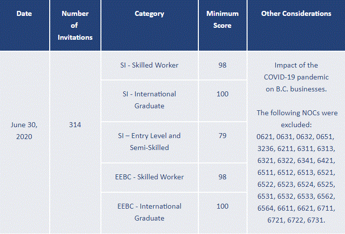当地时间6月30日,BC省移民局发出了最新的省提名计划邀请结果,技术移民类别的最低邀请分小幅下降至98分,全类别共计发出314份邀请,仍有部分职业受疫情影响被排除在邀请范围之外。