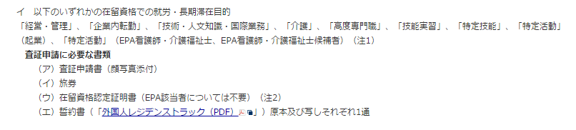 包括:「经营.管理」「企業内転勤」「技术?人文知识?国际业务」「介护」「高度专门职」「技能实习」「特定技能」「特定活动」(起業)「特定活动」(EPA看护师?介护福祉专员、EPA看护师?介护福祉专员候补者)