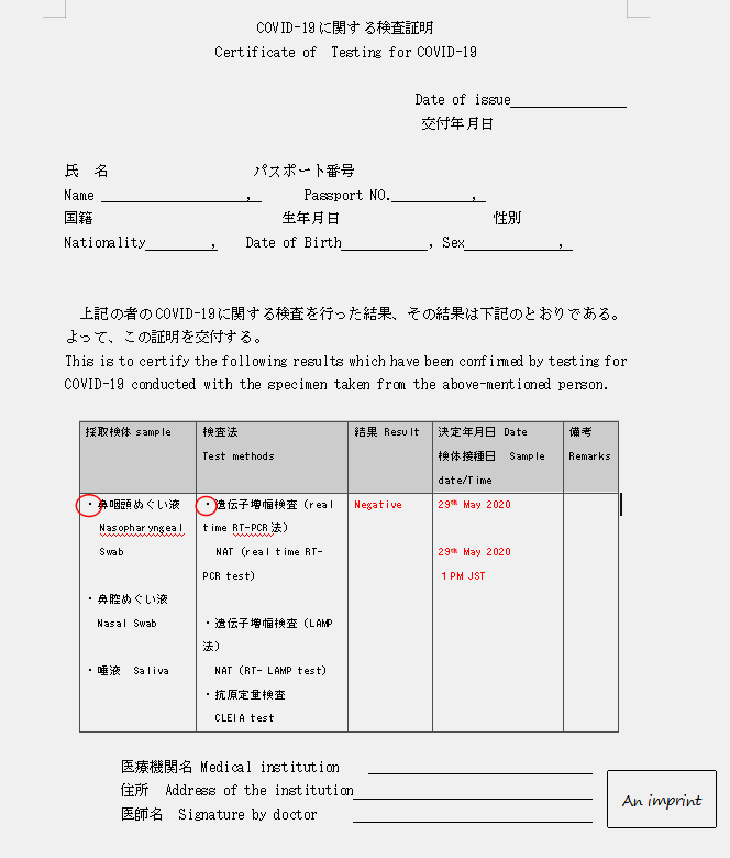 3.如果没有能发行规定格式检查证明的医疗机构,可以提交任意格式证明书,但审查可能会花时间,请谅解。并且任意格式证明书的具体内容,需要与上述规定表格中记载的内容一致。