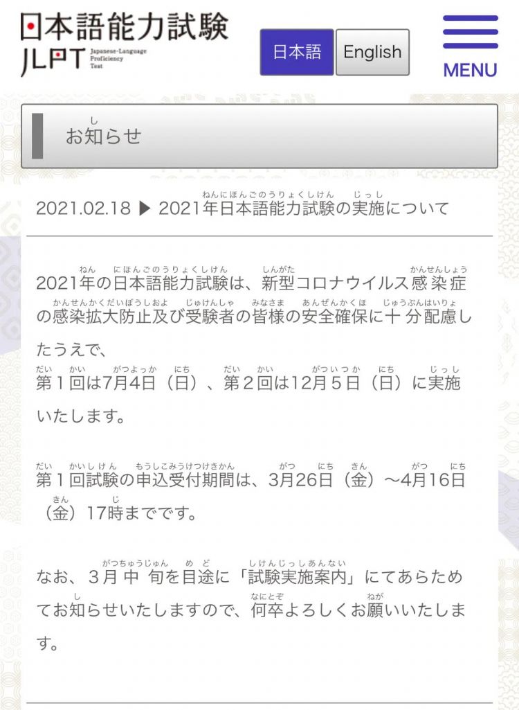 来自日语能力考官方消息:在做好防疫措施基础上,确定实施2021年日语能力考试,两次考试时间分别为7月4日、12月5日。