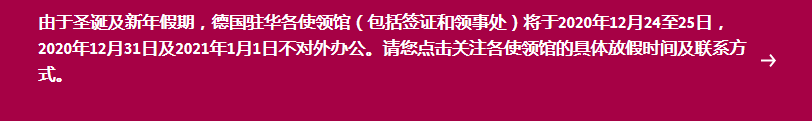 由于圣诞及新年假期,德国驻华各使领馆(包括签证和领事处)将于2020年12月24日至26日,2020年12月31日及2021年1月1日不对外办公。