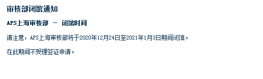 请注意,APS上海审核部将于2020年12月24日至2021年1月3日期间闭馆。在此期间不受理签证申请。