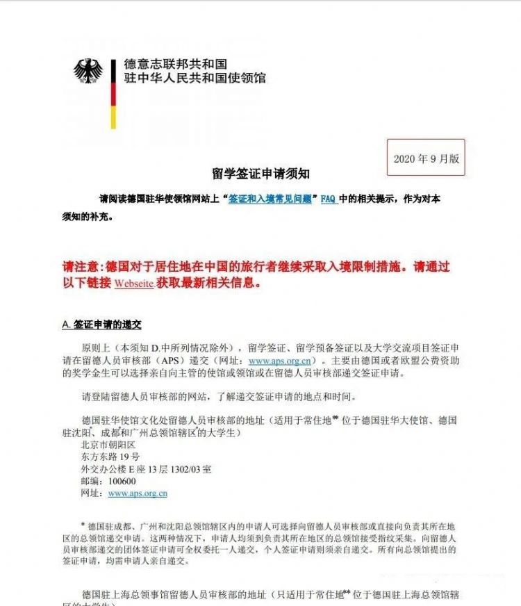 2020年9月,德国驻华大使馆公布了最新的留学签证材料清单,签证材料基本和之前保持一致。