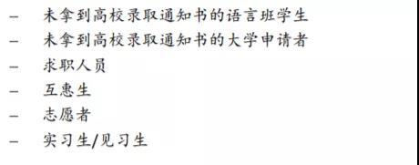 没有拿到大学录取通知书去读语言的学生、没有录取通知书的申请人、互惠生、求职人员志愿者、实习生。
