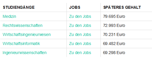 医生在德国挣得多早就不是秘密了。医生是所有德国职业里挣得最多的。然而他们和法学学生一样,学习也是最辛苦的,需要上大学的时间最久。到德国第一次针对医生和律师的国家考试为止,这两个专业的学生都要完成8至10学期的学期,然后是两年的实习期。本科一般至少需要3年,硕士需要两年。下面的专业列出了6学期本科毕业以后工资最高的专业。