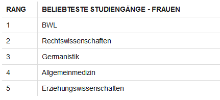 德国联邦统计局每年都会根据数据列出男性和女性最喜欢的专业。