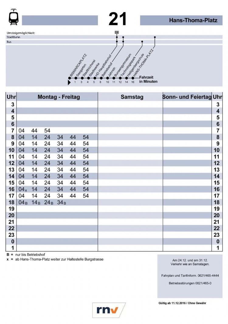 海德堡21路有轨电车的列车时刻表(Fahrplan)