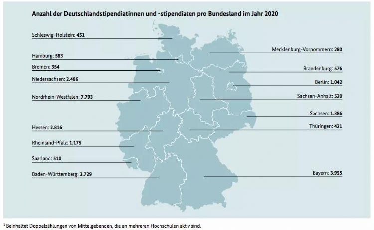 根据学校规模提供奖学金名额。 大家可以你看下德国各联邦州在2020年获得该奖学金的人数: