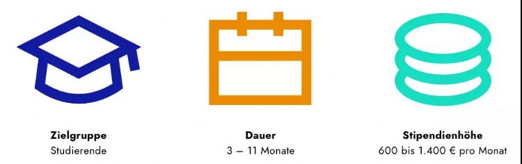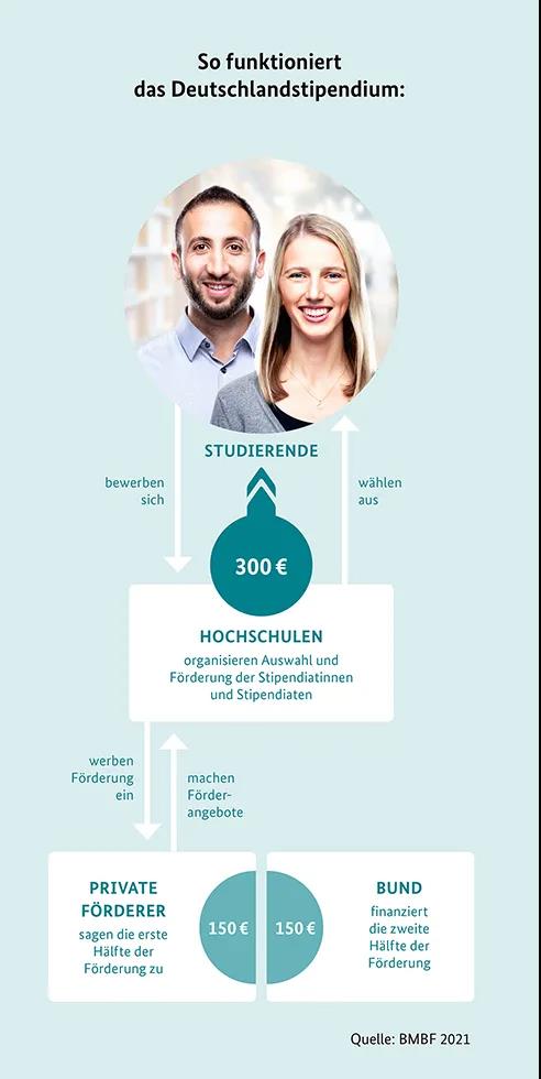 每个月300欧元奖学金(由联邦政府和私人各支付150欧元完成共同资助)。