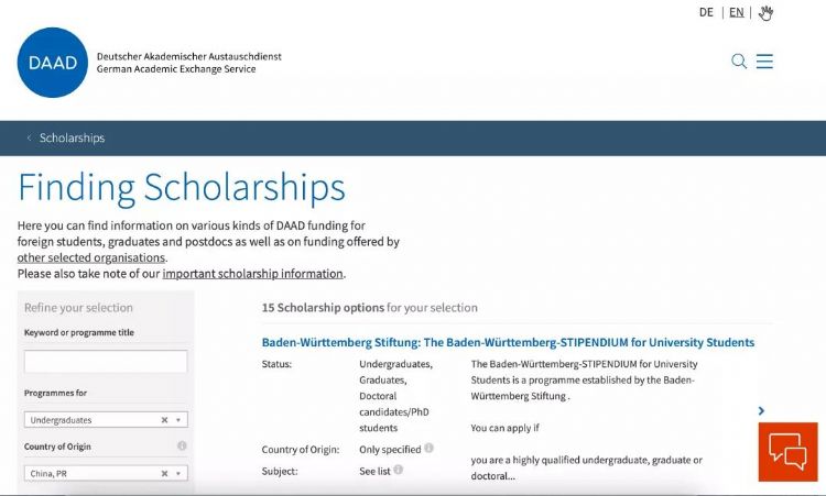 同学们可以在DAAD奖学金数据库里搜索到一些可以申请的奖学金:(https://www2.daad.de/deutschland/stipendium/datenbank):