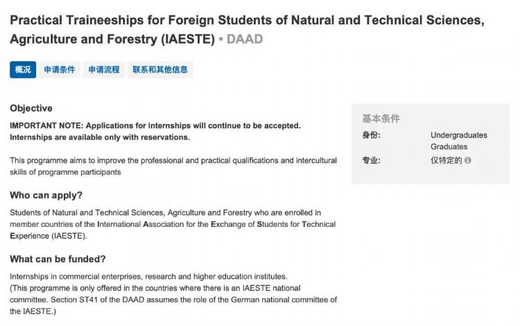再比如这项以奖学金为名义招募的实习项目,面向自然与技术科学、农业和林业 (IAESTE) 外国学生的实习项目,给他们提供能够在海外企业、研究和高等教育机构实习2-3个月的机会。学生每个月的薪酬是 861 欧元,DAAD 承担学生的医疗、事故和个人责任保险。
