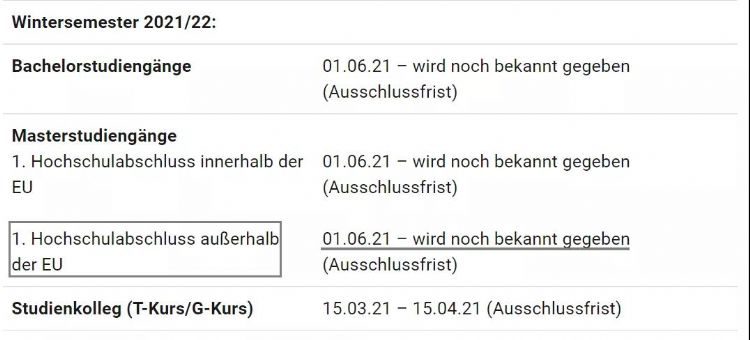 申请提示:2021年冬季学期的申请是6月1号开始,截止日期目前官网还未更新。(之前针对非欧盟的申请时间,冬季学期是1月15日截止,夏季是7月15截止,跟正常的申请时间完全对调了)