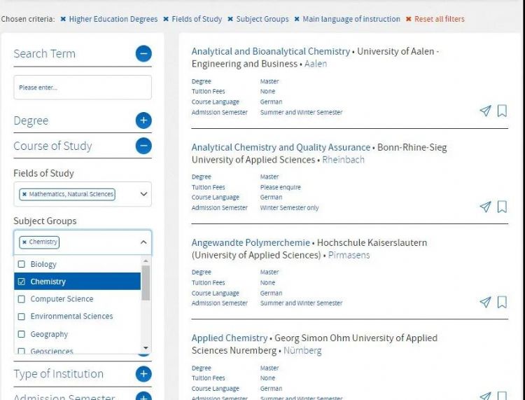 决议化学地址的学科类别:“Mathematics, Natural Sciences”,决定想要要求的学位:以硕士为例,决议课程所需的措辞:以德语为例,即梗概得1100多个相符要求的课程