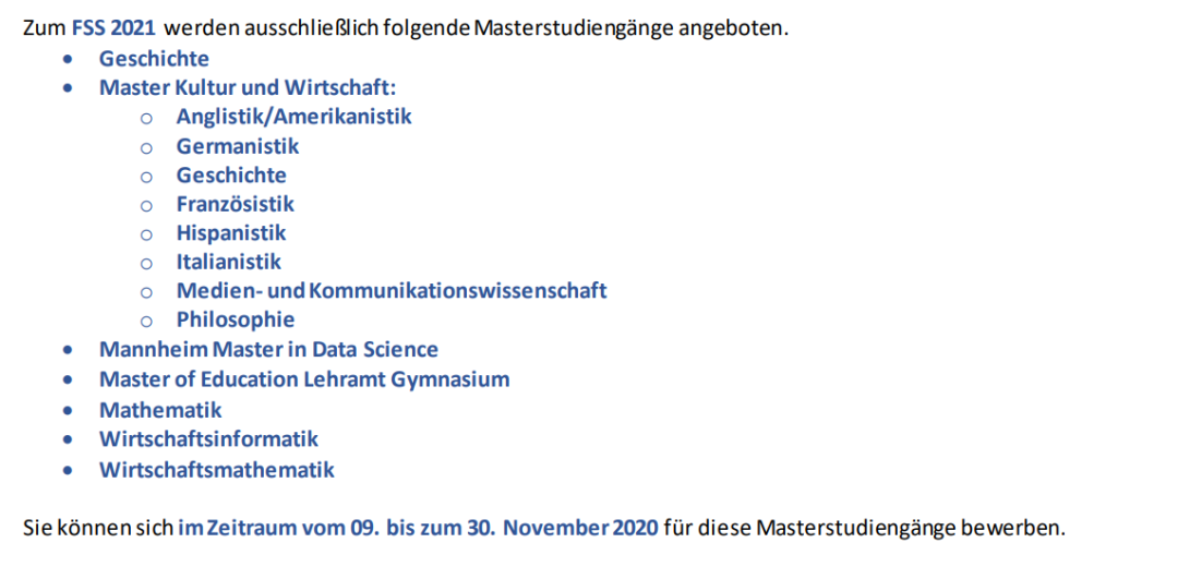 曼海姆大学以下专业2021年夏季学期的申请截止时日为2020年11月30日。
