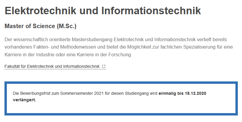 慕尼黑产业大学电气工程及静态技术手段硕士专业2021年夏日学期的申请截止时日为2020年12月18日。