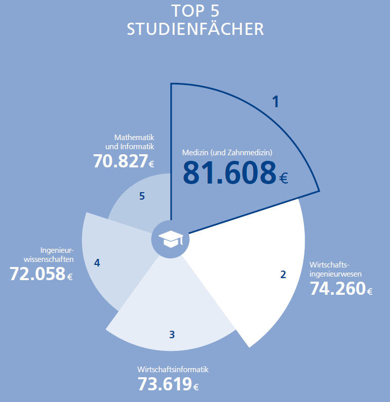 从上图/表数据可见,学医是最有钱途,平均81608欧元(折合公众币约63万)。从此分别是经济工程专业(折合人民币约58万),经济动静专业,项目专业,数学和总计机专业。可见,MINT专业占据了高薪榜单的绝大局部地位,可称之为吸金专业。