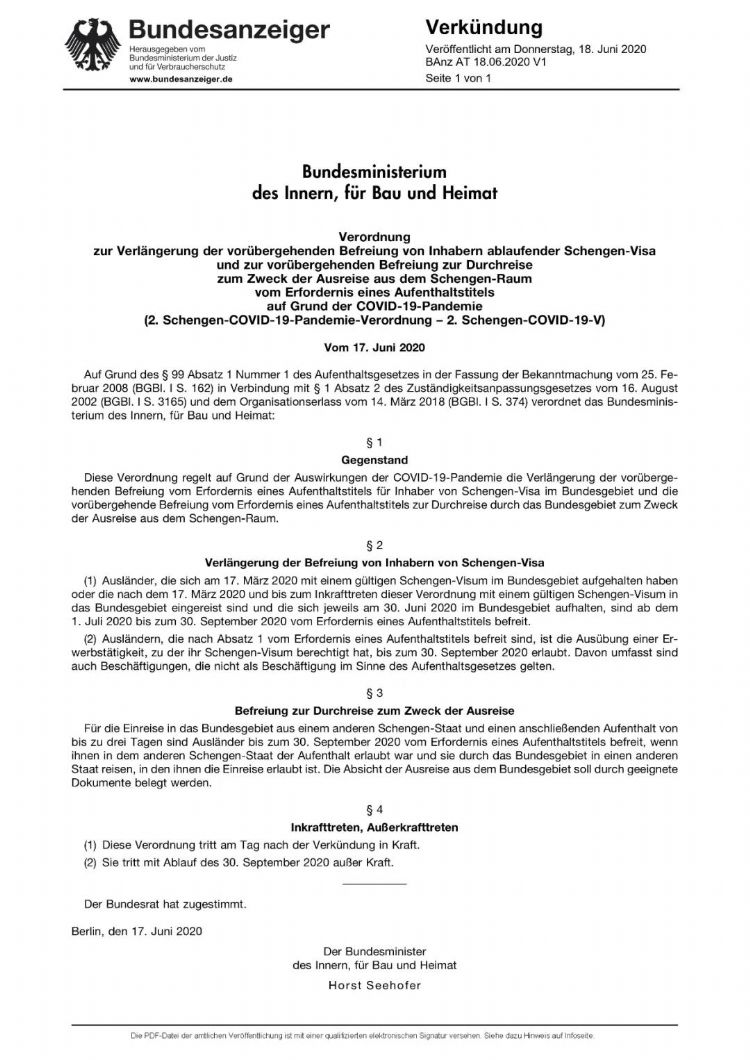 律例全称:Verordnung zur Verl?ngerung der vorübergehenden Befreiung von Inhabern ablaufender Schengen-Visa und zur vorübergehenden Befreiung zur Durchreise zum Zweck der Ausreise aus dem Schengen-Raum vom Erfordernis eines Aufenthaltstitels auf Grund der COVID-19-Pandemie ( 2.Schengen-COVID-19-Pandemie-Verordnung-2.Schengen-COVID-19-V)